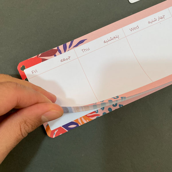 دفتر برنامه ریزی رومیزی هفتگی گل صورتی بر اساس روش چک لیست کارها طراحی شده است تا بر اساس اصول علمی به برنامه ریزی روزانه شما کمک نماید. این ممو پد برای استفاده روزانه مناسب است و به راحتی برای یک سال ( معادل 52 هفته )، نیاز شما در اولویت بندی کارهایتان را فراهم می کنید. ابعاد بسیار مناسب این پلنر رومیزی به شما کمک می کند تا به راحتی آن را همراه خود حمل نماید.
