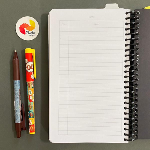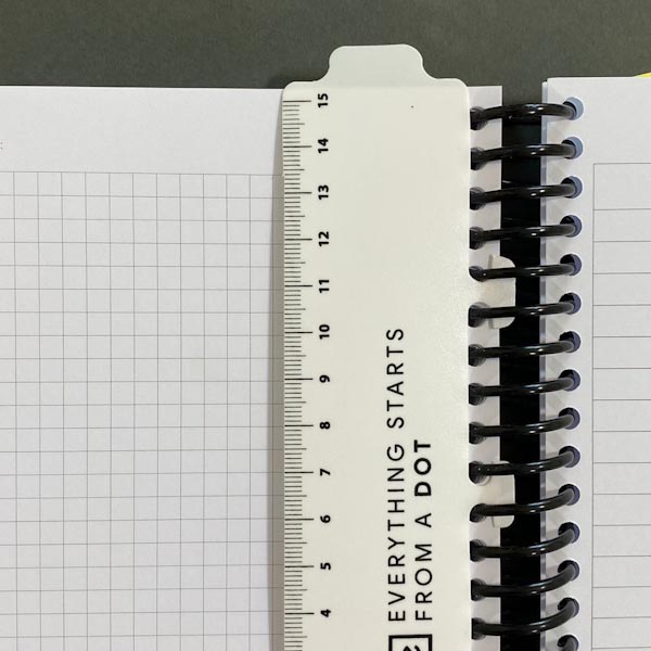 داخل دفتر برگه های شطرنجی سفید رنگ کشور اندونزی داره که لسمش بهت حس خوب میده و بی نهایت با کیفیتن 😀 داخل دفتر یک عدد بوکمارک پلاستیکی داره که مدرج هم هست و خیلی کاربردیه و تازه پشت جلد هم کش نگه دارنده داره. در ضمن سه صفحه index برای فهرست نویسی در اختیارت قرار میده